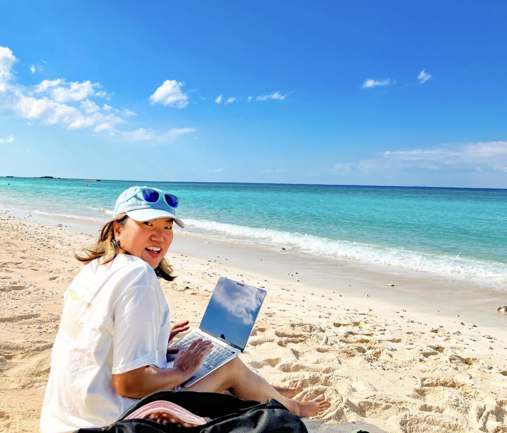 日本の最南端波照間島のビーチで仕事をしている様子