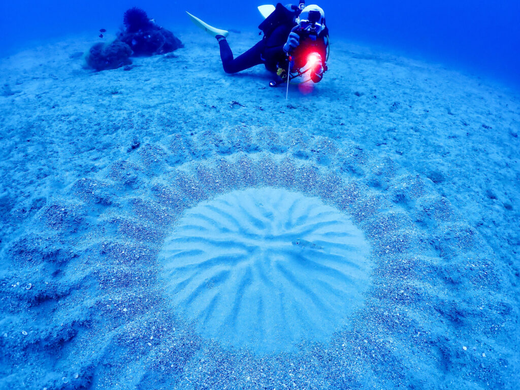 オスがメスにアピールするため&産卵する場所を作るために、巨大な円形の幾何学模様を海底に作り上げている様子