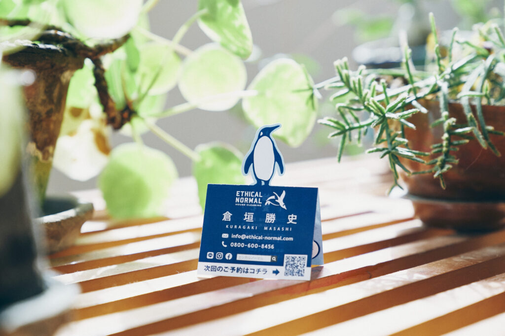 例えば、名刺を作る時は、WEB名刺やバナナペーパーなど様々な案を出し、議論を重ねましたが、最終的に「捨てられない名刺」を作ることになりました。ペンギンの形の切り抜きを入れて、半分折りにするとペンギンが立っているように見える名刺です。