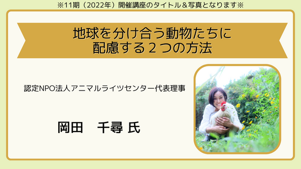 受講してみると知らないことだらけでしたが、今までの点と点の知識が繋がっていくような時間でした。11期で印象に残っている回は、アニマルライツセンター代表理事 岡田千尋さんの「地球を分け合う動物たちに配慮する2つの方法」です。お肉が好きなので日常生活では目を背けてきましたが、畜産動物の現実の残酷さを知ってとてもショックでした。