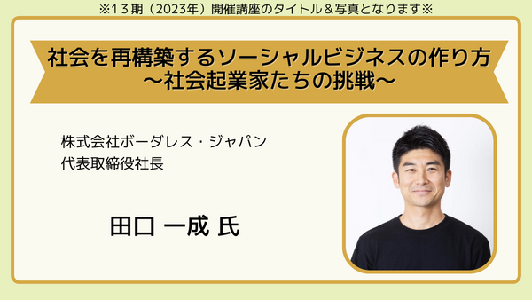 また、最近13期のボーダレス・ジャパン 代表取締役社長 田口一成さんの「社会を再構築するソーシャルビジネスの作り方 ~社会起業家たちの挑戦~」の回を単発で受講しました。ソーシャルビジネスをずっとやってきた人間としては、田口さんは神様のような存在です。田口さんが登壇するイベントへ行き、直接ご挨拶したこともありますが、今回改めて講座を受講できて良かったです。