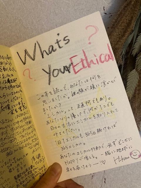 ( 里花さんにいただいた『はじめてのエシカル』に書いたメッセージ。当時店長として働いていたカフェ「ナチュデコ」に本を置いていました )