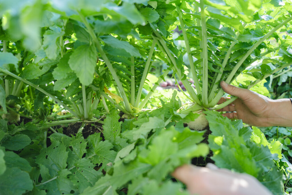 私も将来は野菜全般とお米を作りたいと考えており、現在は自宅の庭や研修生畑で野菜作りを実践しています。土が本来の力を発揮すれば、どこでも野菜は育ってくれます。でも土の状態が良くないと生育が悪かったり虫が来たり病気になったりするので、土が本来の力を発揮できるように、肥料を足すのではなく、生えている草のすき込みや、タイミング良くトラクターを入れることで土の状態を整えることが大切です。