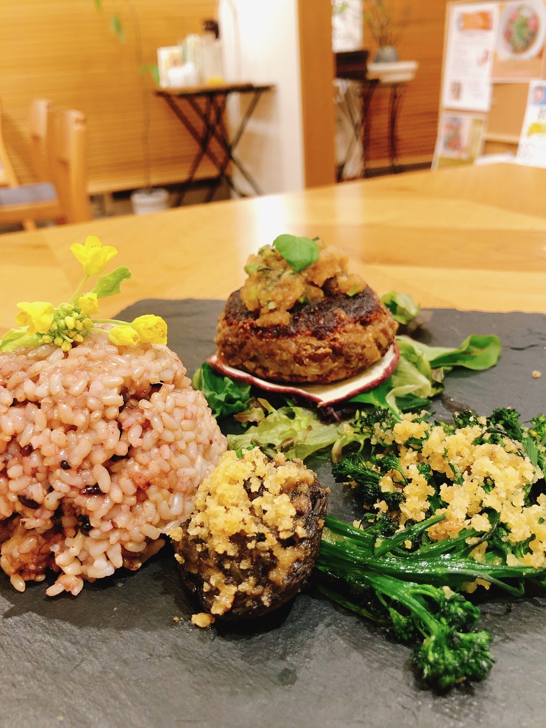 ハンバーグも、バラバラにした豆腐を何度もオーブンで焼いて香ばしさを出しているという手の込んだ一品です。身体が喜ぶ食事とはこのこと、足を運ぶ価値ありです!(予約制)